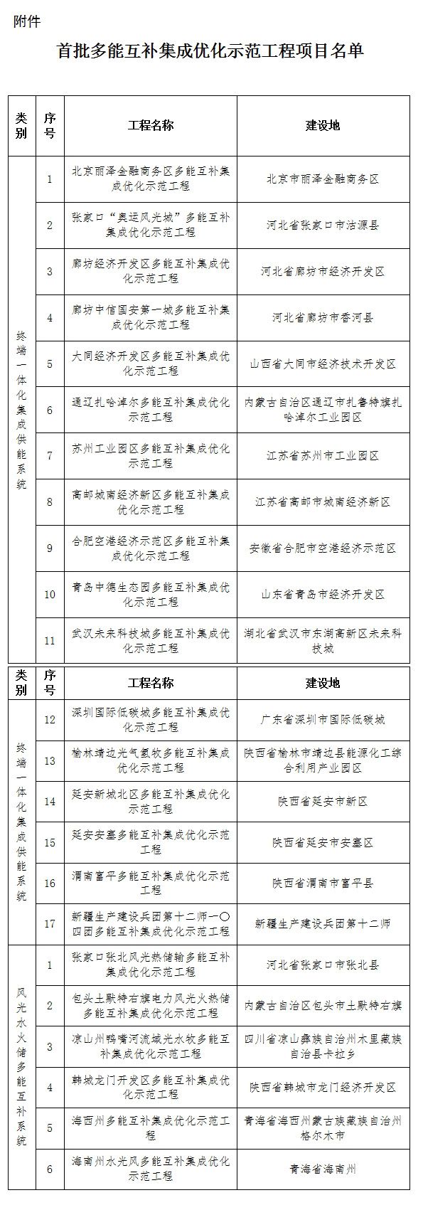 一、首批多能互補集成優化示范工程共安排23個項目,其中,終端一體化集成供能系統17個、風光水火儲多能互補系統6個(詳見附件)。