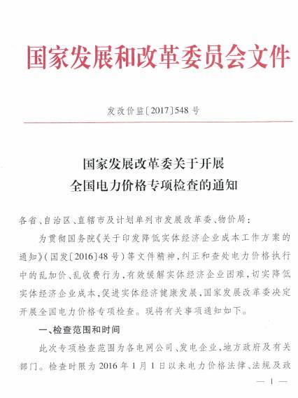 3月21日,國家發(fā)展改革委印發(fā)《關(guān)于全國電力價格專項檢查的通知》(發(fā)改價監(jiān)〔2017〕548號),提出開展全國電價大檢查。